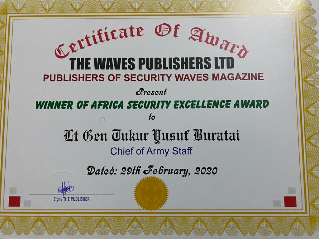 Nigeria’s Army Chief Lt Gen TY Buratai has received the Africa Security Excellence Award today Saturday the 29th of February 2020.