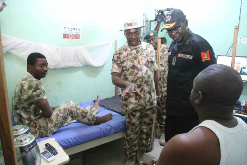 Following the encounter in Gorgi, Borno State and the resultant various degrees of injuries sustained by some troops of Theatre Command Operation LAFIYA DOLE on 22 March 2020, the COAS Lt Gen TY Buratai has on Sunday 5 Apr 20 visited the wounded at the 7 Division Medical Services and Hospital at Maimalari Cantonment Maiduguri, where he went round the Hospital and saw the injured personnel and wish them quick recovery.