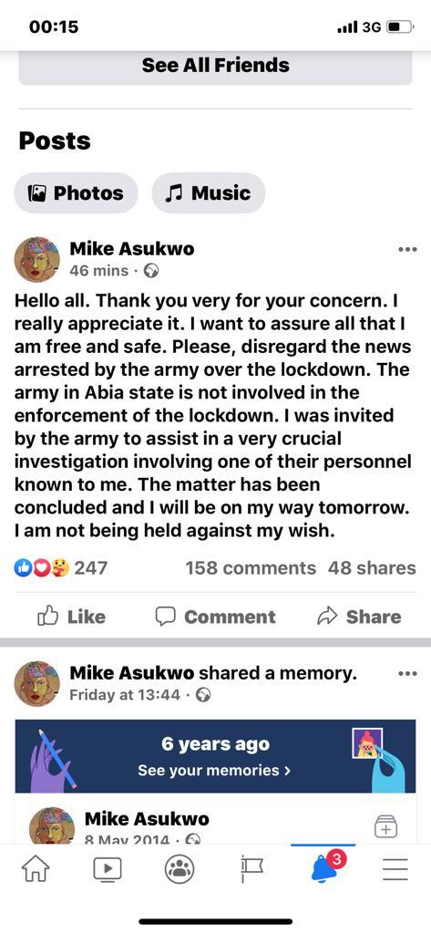 In order to correct the erroneous impression created earlier in the social media, Mr Asukwu was never arrested but was invited by the army in Umuahia in respect of an investigation in a matter which he is privy to. He has since via his Facebook page and Twitter handle dismissed the claim that he was arrested.